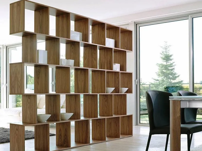Стеллаж, который используется для разделения зон комнаты, также помогает освободить помещение от установки полок на стенах. Благодаря этому пространство выглядит легким и свободным.