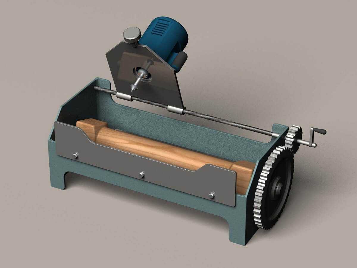 На подвижную каретку, способную двигаться перпендикулярно оси вращения заготовки, устанавливается ручная фрезерная машинка. При этом расстояние до центра заготовки определяется упорно-направляющим роликом, который перемещается по шаблону.