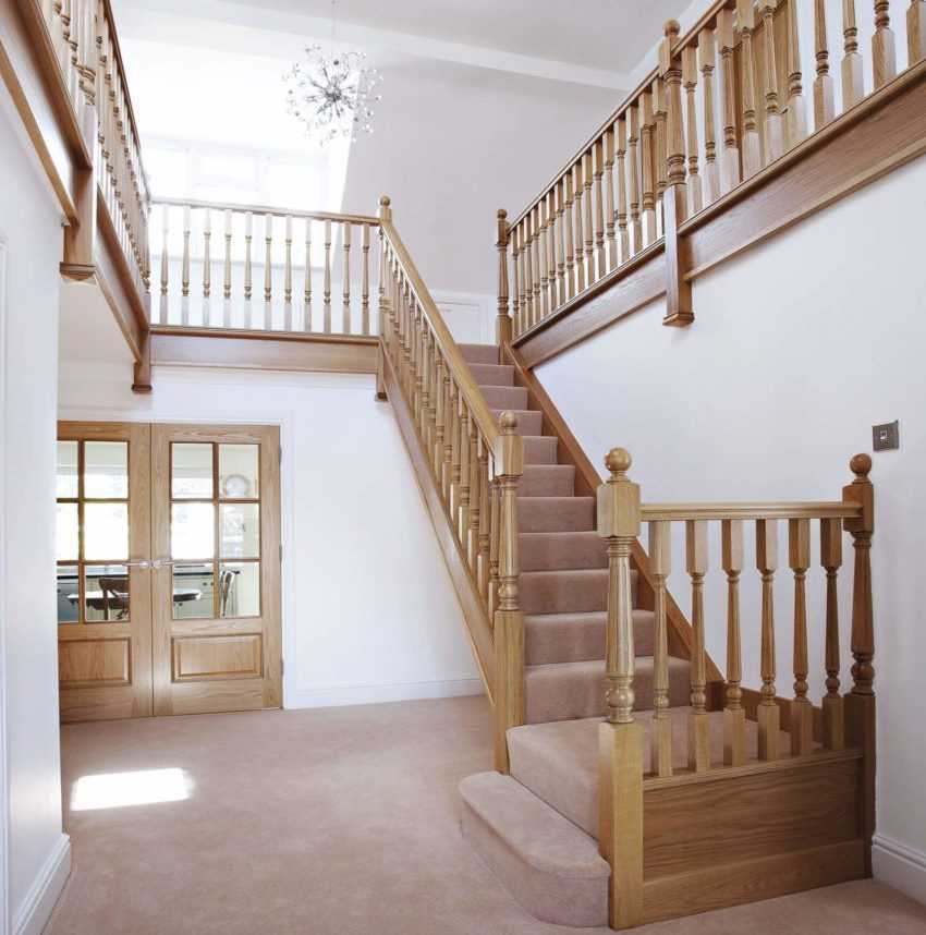 - Универсальность. Древесные перила могут органично вписаться в любой интерьер – они выгодно подчеркивают классику, составляют единое целое с кантри и провансом, а также стильно оттеняют модерн.