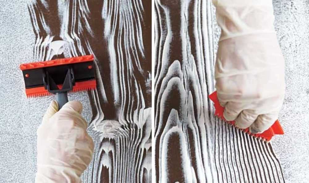 Сначала дверь покрывается краской одного цвета (также светлого), после высыхания второй слой более темной краски. Берут специальную щетку с рельефной поверхностью (ее можно приобрести в любом строительном магазине) и проводят ею по еще сырому покрытию. Так самопроизвольно появляются линии и завитки, которые в совокупности дают имитацию древесного узора. После высыхания декоративный слой шлифуется для придания естественности и покрывается лаком.