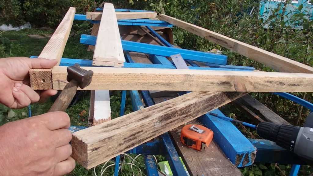 - Полученные заготовки разложите на земле так, чтобы по диагонали они были равны будущей конструкции, а два горизонтальных фрагмента соответствовали ширине полотна.