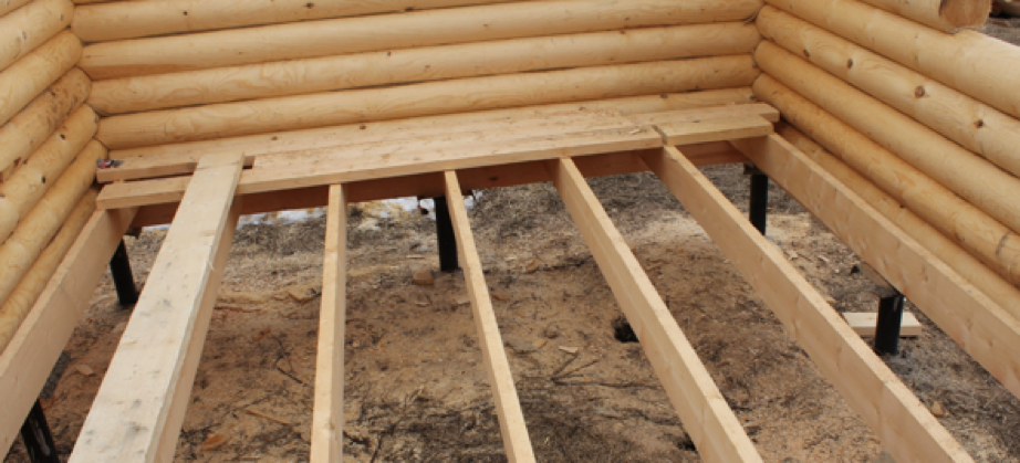 Половая доска укладывается на лаги. Их делают так же из досок 40-50 мм, поставленных на ребро. Для фиксации лаг на нижнем венце, можно использовать специальные скобы или металлические уголки, крепят их саморезами или гвоздями.