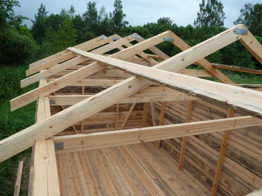 Каркас кровли делается из бруса. На него укладывают обрешетку из досок. Под рубероид – сплошную, для металлочерепицы, профлиста и шифера – с шагом, но не более 60 см.