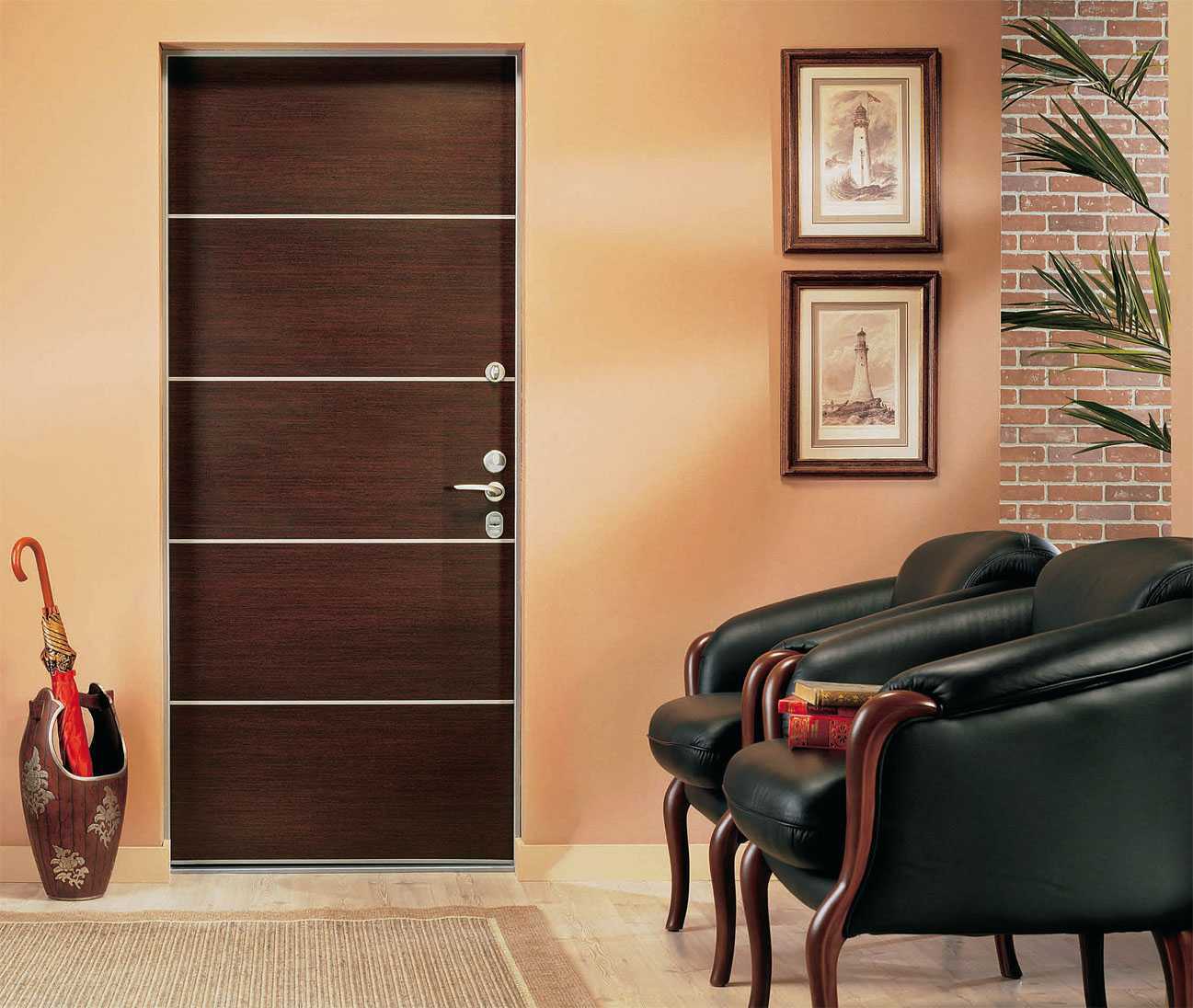 Натуральная структура выглядит естественно. При данной обработке прихожей присуща элегантность, роскошь. Поверхность отлично моется. Если оформляется помещение под темные двери, обязательно где-то должны быть светлые вставки на стенах. Материал нетоксичен, обладает тепло- звукоизоляционными свойствами.