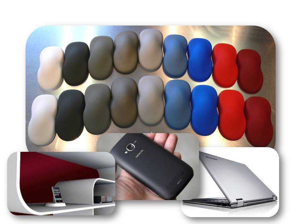 Вещи, к которым часто трогают руками, должны быть по возможности приятным на ощупь. Данный вид прекрасный выбор для покраски телефонов, ручек мебели, пластмассовых игрушек, косметичек, строительных инструментов. Этот краситель кроме комфортного прикосновения, также приглушает звук и свет, может придать предмету эстетический вид.