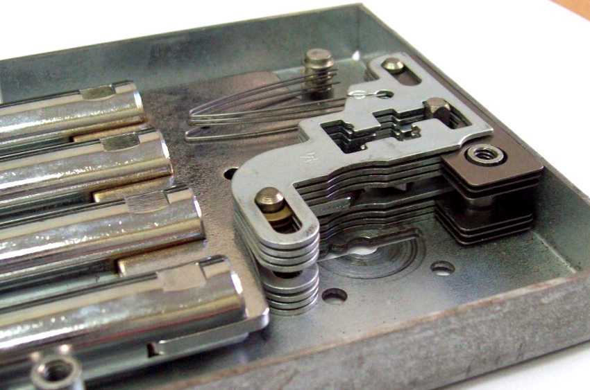 Пружины отводятся в сторону. Пластины, нанизанные на особые крепежи, контактирующие с хвостовиковой стойкой, извлекаются из корпуса. После манипулирования пластинами, осуществленного согласно поставленным задачам, секретный механизм собирается обратно. Каждая отдельная пластина вставляется в крепежные детали и подпружинивается. После монтажа всех элементов закрывается и привинчивается крышка замочного корпуса.