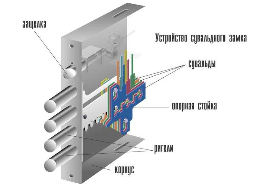Этот замок состоит из нескольких пластин с разными выемками и пазами. От их количества зависит сложность, класс безопасности устройства. Чтобы взломать замыкающий механизм, нужно добиться смещения пластин. Как открыть железную дверь без ключа с сувальдным замком: