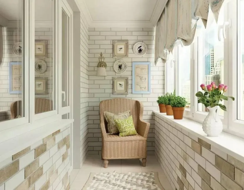 Лоджии маленьких габаритов можно отделать штукатуркой, а декоративные плитки под камень станут отделочным элементом вокруг проемов.