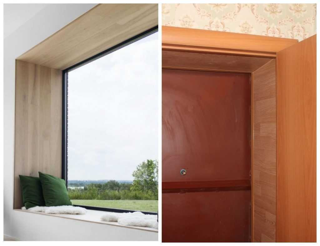 Специальные фигурные планки, называющиеся наличниками, помогут заделывать не такой уж большой зазор снаружи между коробкой и проемом. Такие планки входят в установочный комплект. Но внутри помещения получается широкое пространство, образующееся после того, как положили кирпичи и нанесли бетонный раствор. Нужно использовать три уровня отделки для того, чтобы утеплить, защитить и декорировать.