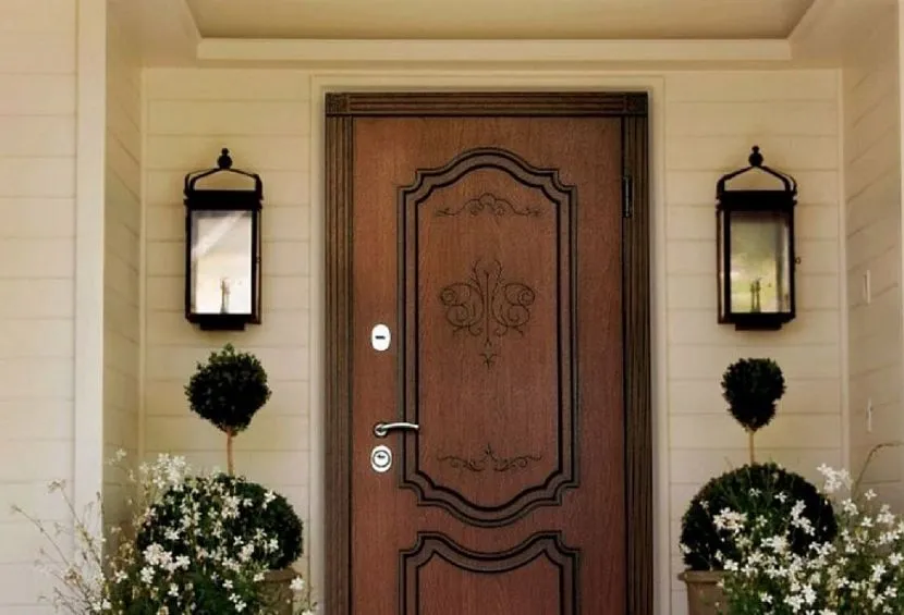 Панели хорошо переносят температурные скачки, не выгорают на солнце и обладают отменными изоляционными свойствами. Для декорирования дверей используют как гладкие панели, так и накладки с узорами, вырезанными при помощи фрезы. Обшивка из МДФ хорошо сочетается с такими элементами декора, как молдинги, эксклюзивные и оригинальные замки, выкованные вручную детали и т.д.