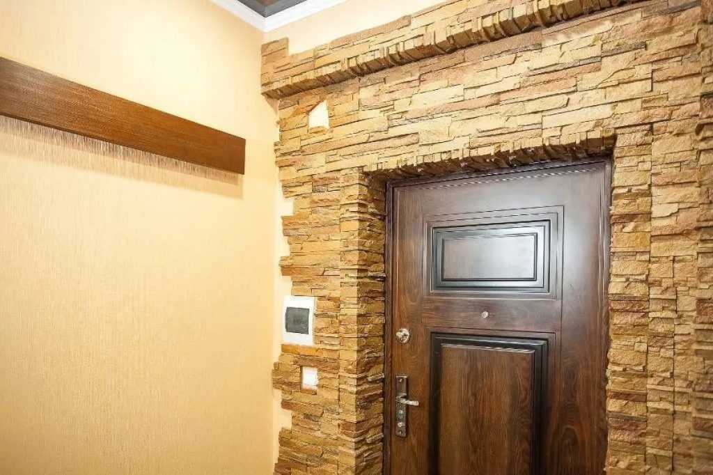 Взаимодополняемость. Камень отлично вписывается в другой стиль облицовки стены. Размещение пластин на небольшом фрагменте поверхности рядом с дверями создает оригинальный вид. Если оформление двери происходит в коридоре, то плавный переход пластин к мебели в виде обычной полоски будет прекрасным сочетанием