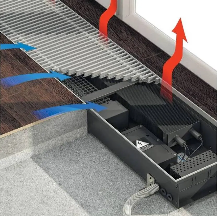 Оборудование конвекторного типа монтируется с соблюдением одного важного условия – в подоконнике обязательно должны быть сформированы вентиляционные отверстия для выхода теплого воздуха, а в стенах – для поступления холодного. В приборах нагревательный элемент представлен чаще биметаллической спиралью либо металлокерамическим ТЭНом