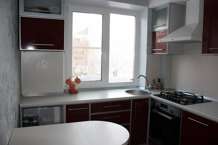 При отсутствии балкона или лоджии подоконник можно полностью переоборудовать, превратить его в рабочую поверхность с мойкой в углу, шкафчиками или полками под столешницей или обеденный стол.