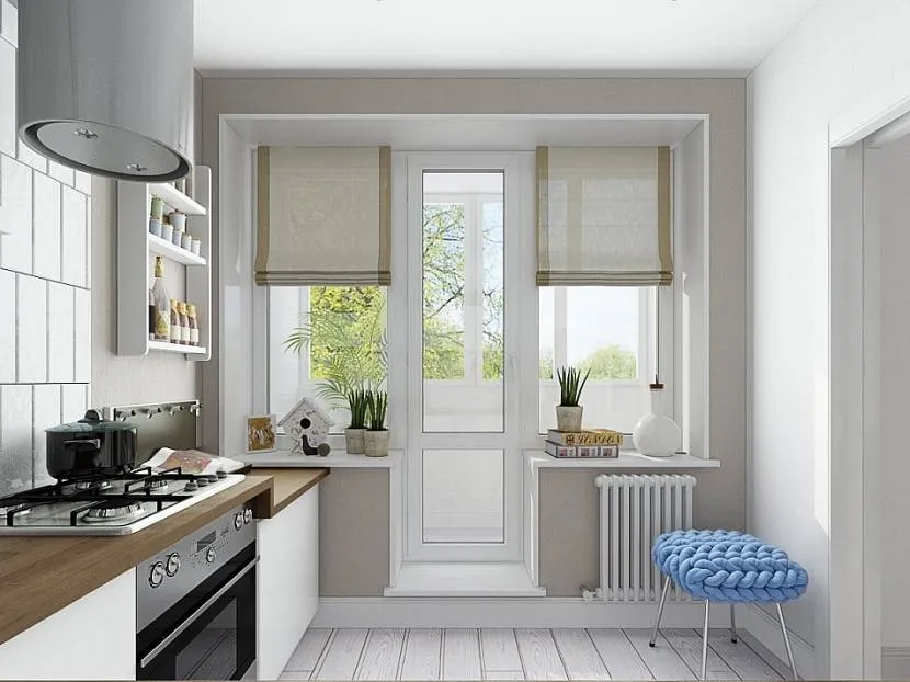 Если кухня 5 кв метров соединена с балконом или лоджией, не обязательно сносить подоконник. Его можно превратить в барную стойку.