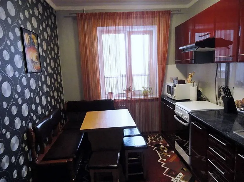 Внимательно следует отнестись к выбору текстиля. Занавески подбирают таким образом, чтобы они не препятствовали доступу дневного света. Подойдут легкие полупрозрачные материалы светлых оттенков, которые вешают на длинный карниз по длине всей стены. Занавески подбирают под цвет кухонного фартука.