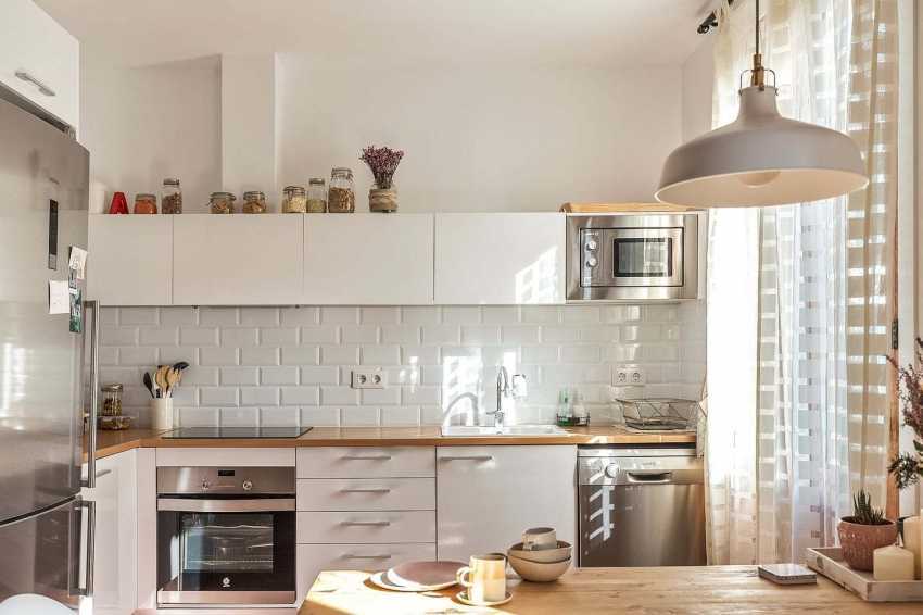 В небольших помещениях стены лучше отделывать в светлых тонах. Они визуально увеличивают объем и кажутся не нагруженными. Для стен в кухне есть несколько вариантов отделки: