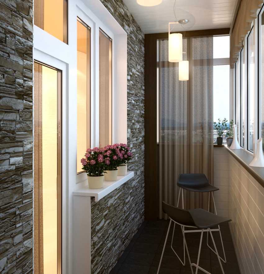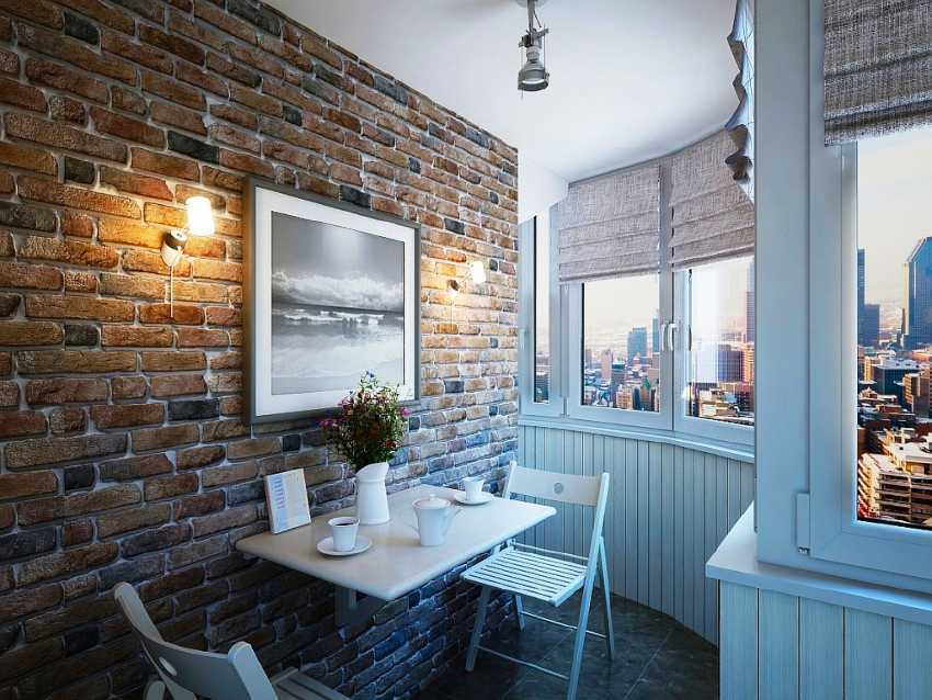 При таком подходе отделка балкона внутри должна перекликаться с оформление кухни. Неплохо смотрится отделка под кирпич в сочетании с гладкими стенами из гипсокартона.